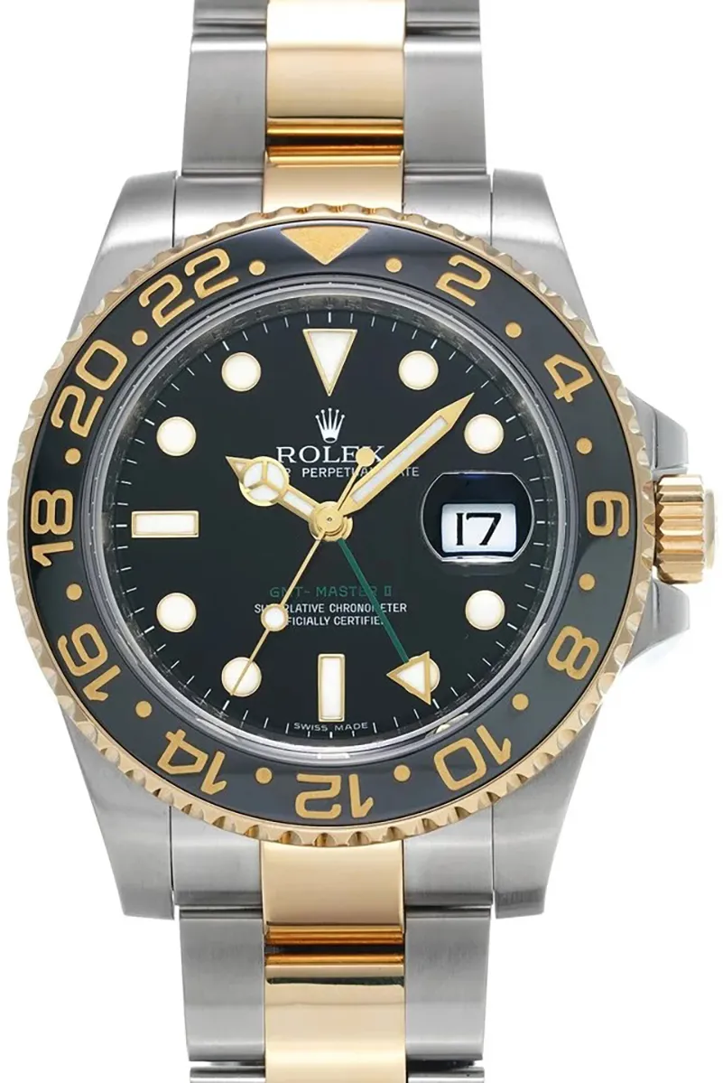 The men’s Rolex GMT-Master II 116713LN watch. includes a brushed 904L Oystersteel stainless steel case, an oyster bracelet, and a polished solid yellow gold finish. Bidirectional rotating bezel with black Cerachrom inlay ceramic and 24-hour engraved numerals and graduations. Luminescent hands, indices, and dot hour markers adorn the black dial. At three o’clock, the date is shown in the pane beneath the cyclops lens with an instantaneous date setting. The GMT second time zone functionality allows the hour hand to be independently set. Designed to display the time in two distinct time zones concurrently during travels across continents, the GMT-Master II is known for its durability and adaptable design.